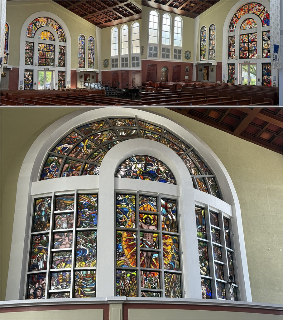 The beautiful stained glass on the sides and back of the cathedral clearly shows its beauty and sacredness.