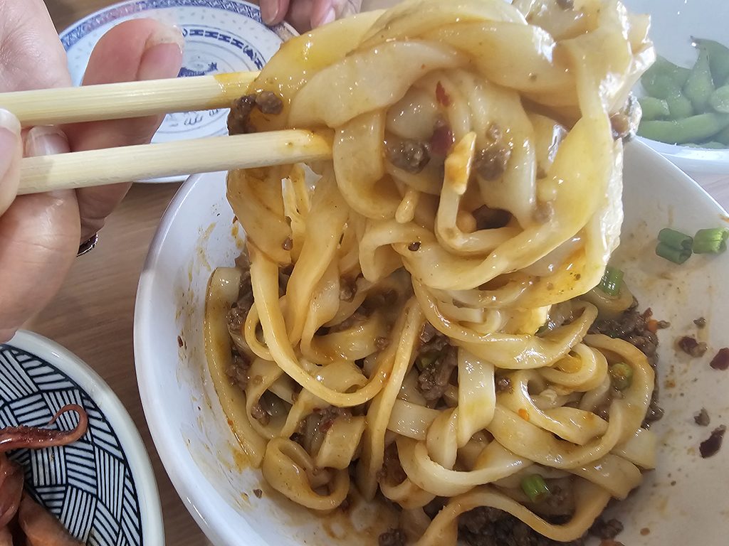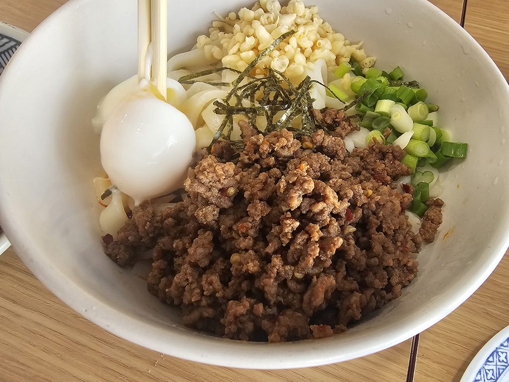 달콤하고 매콤하게 졸인 다진 고기와 튀김 부스러기, 그리고 파를 쫄깃한 기시멘 면과 반숙 계란에 비벼 먹습니다. 반숙 계란의 부드러움이 적당히 매콤한 다진 고기와 쫄깃한 기시멘에 어우러져 절묘한 맛을 선사합니다! 식욕을 돋우는 중독성 있는 맛이라 젓가락을 멈출 수 없을 정도입니다.