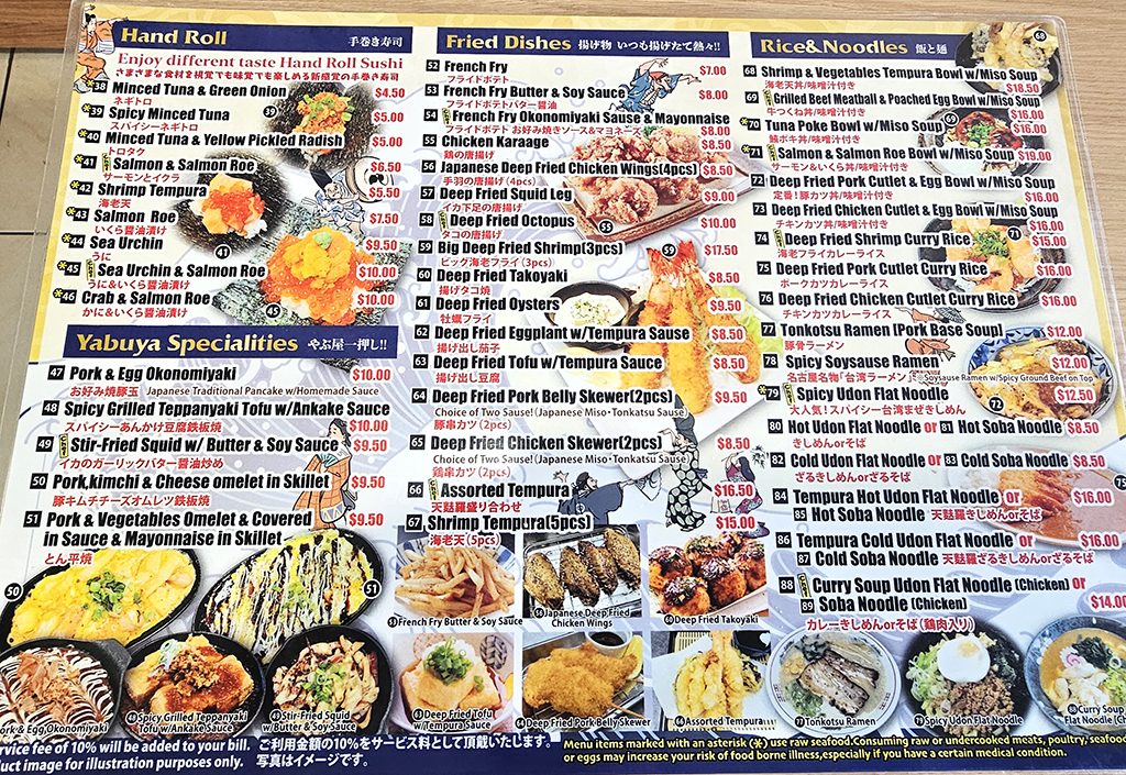 푸짐한 식사를 원하시는 분들을 위해 38번부터 89번까지는 손으로 말아 먹는 스시부터 야부야 추천 메뉴인 오코노미야키와 안카케 두부 (걸쭉한 소스에 넣은 두부)까지 다양한 선택지를 제공합니다. 또한, 훌륭한 맛의 돈페이야키 (돼지고기와 계란 오믈렛), 갓 튀긴 새우튀김, 오징어튀김, 그리고 술과 완벽하게 어울리는 매콤한 테바사키 (닭날개)도 놓칠 수 없습니다. 모듬 튀김도 있으며, 제대로 된 식사를 원하시는 분들을 위해 다양한 덮밥, 카레, 그리고 나고야의 명물인 대만 라멘까지 준비되어 있어, 정말 다양한 선택을 즐기실 수 있습니다!