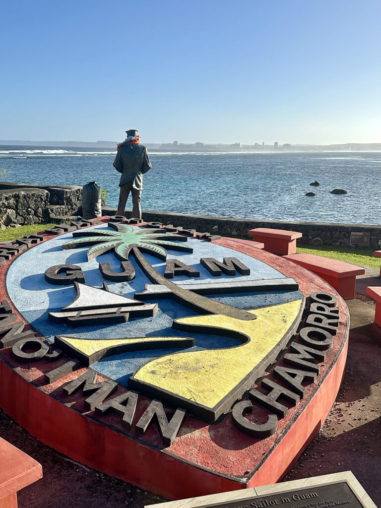 조금 더 가면 첫 번째 촬영 명소인 괌 문장(Guam Seal)과 미국 해군 군인 동상이 보입니다. 현재 괌의 번영과 1975년 베트남에서 피난민들을 구한 미국 해군의 공로를 기리기 위해 만들어진 두 개의 기념물입니다. 두 동상 모두 2018년에 설치되었습니다.