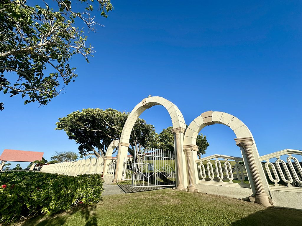 그다음에는 계속 직진하여 언덕을 오르는데, 언덕에 올라가기 전에 있는 이 문은 사실 괌 역사와 관련이 있는 것 중 하나입니다. 괌은 16세기부터 300년 이상 스페인 지배 하에 있었고, 이 아치형 문은 스페인 건축 영향을 받은 것으로 알려져 있습니다. 하가냐의 스페인 광장 등에서도 흔히 볼 수 있는 형태입니다. 아무 생각 없이 지나치면 그냥 문일 뿐이지만, 괌의 역사와 관계된 문입니다.