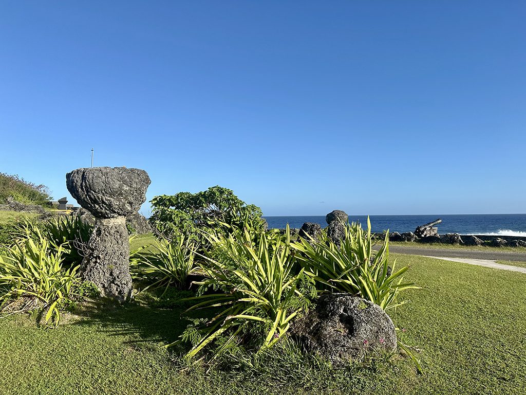 그 근처에는 라떼 스톤(Latte Stone)이 있습니다. 이것은 복제본이지만 고대 차모로 문화의 대표적인 유적지입니다. 라떼 스톤은 ‘할리기(Haligi)’라고 불리는 기둥과 ‘타사(Tasa)’라고 불리는 반구형 돌로 이루어져 있으며, 고대 차모로 사람들의 고상 집의 기초였다고 여겨집니다. 하지만 다른 설도 있고, 여전히 밝혀지지 않은 괌의 역사 중 하나입니다.