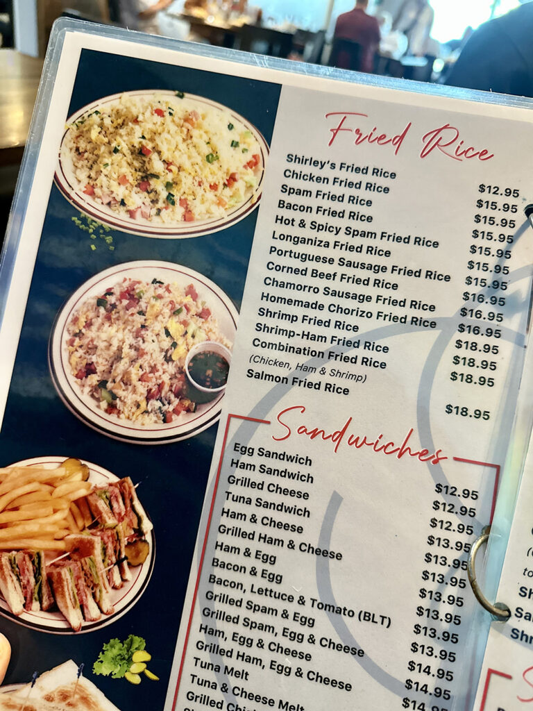 인기 메뉴는 팬케이크, 오믈렛, 그리고 괌 사람들이 좋아하는 프라이드 라이스(fried rice)로, 14가지 종류가 준비되어 있습니다.