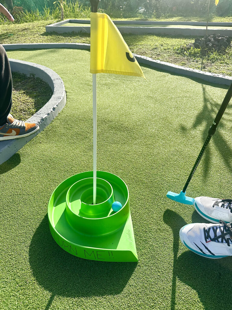 어떤 홀에는 컵 근처에 이런 장치가 놓여 있어서, 힘을 잘 조절해야만 공이 경사로를 올라 끝까지 올라갑니다… 다양한 재미있는 장치들이 많아서 정말 즐거운 미니 골프입니다.