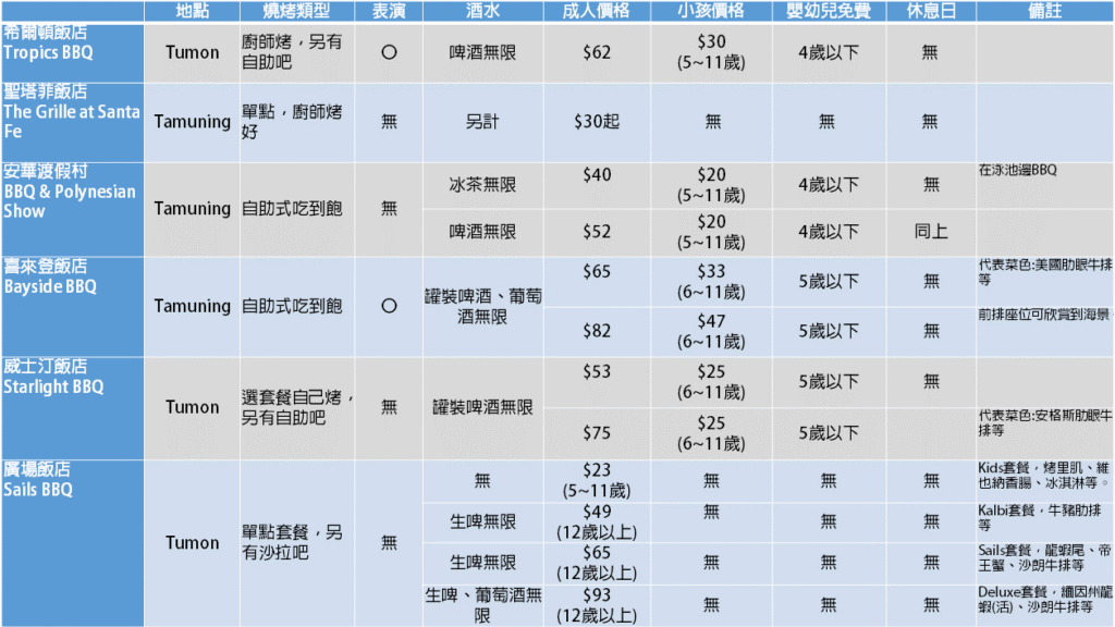 ※先比較出自己所想要的燒烤類型,就比較不會霧沙沙了,食材詳細資料因為常因店家更新而有所不同,本篇就不多加描述了,價格的話僅供參考,還是以店家實際更新狀況為主,但都建議出發前能夠先預約好,畢竟關島也是個度假天堂,有些餐廳可是非常搶手的,希望大家都能有趟愉快美妙的關島之旅喔。